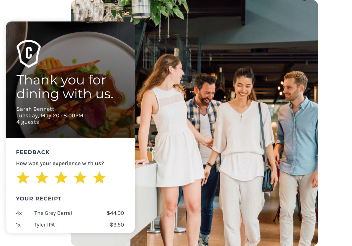 Allow diners to pay with a card on file instead of flagging down a server or waiting for a bill. Guests simply walk out when they’re done, while you build long-term relationships with diner data.
